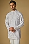 Featuring an ice blue kurta in silk chanderi base with threadwork and bead hand embellishments. Style it with pants and mojaris for a festive occasion, cultural event, wedding or sangeet ceremony.