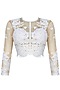 This set features an ecru and nude crop top in silk organza base with floral lace applique work highlighted with beads embellishment all over the front and back. It is paired with nude and ecu flared skirt with floral lace applique work and beads embroidery all over the ghera.