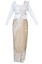 Featuring a nude and ecru saree in silk organza base with thread and applique embroidery. it is paired with a floral embroidered blouse, a belt and a scalloped jacket. Accentuate it with statement jewellery or heels for a cocktail party, engagement or sangeet ceremony.