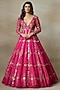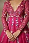 Featuring a pink gown in silk organza base with floral work on the neckline, cutwork detailing, diamond-shaped sequins, resham, beads and dabka work hand embroidery. Accentuate it with statement earrings and heels for a bridal look.