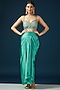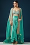 Featuring a blue cape in organza base. It is paired with a matching flat chiffon embellished crop top and satin dhoti skirt.