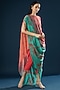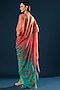 Featuring a coral and blue asymmetric draped kurta in double georgette, flat chiffon and crepe base with print, tassel details and hand embroidery. It is paired with a matching inner and pants.