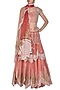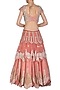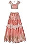 Featuring a coral layered lehenga skirt in sheer silk and shimmer chanderi base with tissue-chanderi applique, dabka, pitta and pearl embellishments. It is paired with a matching blouse and ombre dupatta in tulle base.