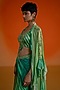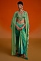 Featuring a green blouse in georgette and modal satin base with crystal and pearl embellishments. It is paired with a printed dhoti skirt and a cape. Accentuate it with jewellery, embellished heels and a potli bag for a wedding ceremony or festive occasions.