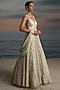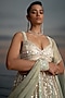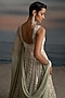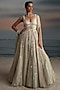 Featuring an ivory gown in tulle and georgette base with sequins and pearl embroidery and an attached drape. Accentuate with polki jewellery and heels for an engagement or sangeet ceremony.