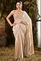 Featuring a metallic champagne ombre draped saree in tulle and foil georgette base with crystal and sequins embroidery. It is paired with an off-shoulder blouse. Accentuate it with dangler earrings and heels for a wedding or sangeet ceremony.