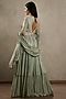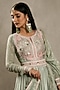 Featuring a mint green tiered anarkali in shimmer georgette base with resham, mirror, sequins, and zardosi embroidery. It is paired with matching silk churidar pants, mukaish georgette dupatta, and a belt.