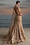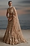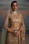 Featuring an old rose fish-cut lehenga in tulle base with pearl, resham and crystal embroidery. It is paired with an embroidered blouse, a belt and a peach dupatta. Accentuate with polki jewellery and heels for a perfect bridal look.