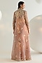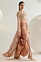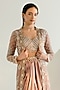 Featuring an onion pink jacket in organza and japanese satin base with pearl and sequins hand embroidery. It is paired with a textured blouse and a draped dhoti skirt. Accentuate it with statement jewellery and heels for a cocktail party or engagement ceremony.