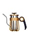 Featuring a set of three gold coffee makers crafted from borosilicate glass, stainless steel, and aluminum. The Swan-like grace of these coffee makers finds a balancing contrast with hard engineering. This set includes one lid with temperature gauge, one aluminum fins and one kettle bottle.