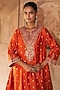 Sheetal Batra presents a mesmerizing burnt orange choga kurta in pure silk chanderi banarasi base with bell sleeves, pearl, sequins, kashmiri tilla and gota patti embroidery. It is paired with bamberg satin salwar pants. Style it with meenakari statement earrings, a half-up braided hairstyle and wedges, ideal for sangeet ceremonies or colorful festive gatherings.