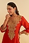 Featuring a burnt orange long kaftan in upada silk base with a zero-neckline, kiran dori and pearl embroidery. It is paired with dogri salwar pants. Style it with traditional juttis, a potli bag, and statement earrings to complete the ethnic look, ideal for festive gatherings, cultural events, or family celebrations