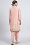 Featuring a carnation pink short kurta in chanderi silk banarsi and bamber satin base with tilla embroidery, mandarin collar, a placket, and pearl detailing. It is paired with a matching dhoti.