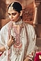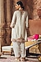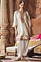 Sheetal Batra presents a mesmerizing daisy ivory A-line kurta in pure silk banarasi base with bell sleeves, pearl, sequins, kashmiri tilla and gota patti embroidery. It is paired with bamberg satin salwar pants and a silk organza dupatta. Style it with meenakari statement earrings, a braided hairstyle and wedges, ideal for engagement ceremonies or colorful festive gatherings.