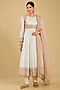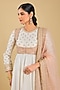 Featuring a daisy ivory anarkali in silk chanderi base, adorned with dabka and zardosi embroidery. It is paired with an embroidered jacket, a glazed cotton churidar, and a silk organza dupatta. Style it with polki jewellery, an embellished clutch and heels for a wedding or engagement ceremony.