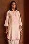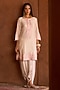 Sheetal Batra presents a daisy ivory short kurta crafted in silk chanderi, adorned with delicate scalloped detail, pink parsi gara, sequins, and pearl embroidery. It is paired with bemberg satin dhoti pants, creating a light and festive silhouette. Style it with kundan polki jewellery, a potli bag, and block heels for sangeet, or celebratory occasions.