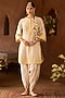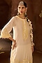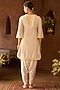 Sheetal Batra presents a daisy ivory short kurta crafted in silk chanderi, adorned with delicate scalloped detail, lemon yellow parsi gara, sequins, and pearl embroidery. It is paired with bemberg satin dhoti pants, creating a light and festive silhouette. Style it with kundan polki jewellery, a potli bag, and block heels for sangeet, or celebratory occasions.