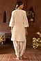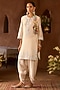 Sheetal Batra presents a daisy ivory short kurta crafted in silk chanderi, adorned with delicate scalloped detail, blue parsi gara, sequins, and pearl embroidery. It is paired with bemberg satin dhoti pants, creating a light and festive silhouette. Style it with kundan polki jewellery, a potli bag, and block heels for sangeet, or celebratory occasions.