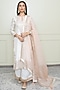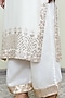 Featuring a daisy ivory kurta in silk chanderi base with kashmiri tilla, pearls, and gota embroidery. It is paired with matching bemberg palazzo pants and a pearl pink silk organza dupatta.