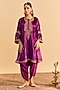 Sheetal Batra presents a deep purple A-line choga kurta crafted in velvet silk base with sequins, pearls and aari tilla embroidery. It is paired with upada silk tulip dhoti pants. Accentuate the look with ethnic earrings, an embellished potli bag and wedges for perfect festive gatherings, wedding functions or cultural celebrations.
