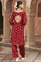 Sheetal Batra presents a mesmerizing deep red short kurta in pure silk chanderi banarasi base with pearl, sequins, kashmiri tilla and gota patti embroidery. It is paired with bamberg satin salwar pants. Style it with meenakari statement earrings, a half-up braided hairstyle and wedges, ideal for sangeet or colorful festive gatherings.