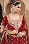 Sheetal Batra presents a mesmerizing deep red kurta in silk chanderi and pure banarasi base with pearl, sequins, kashmiri tilla and gota patti embroidery. It is paired with sharara pants having boota embroidery and an embroidered silk organza dupatta. Elevate the look with polki jewellery, a twisted braid and embroidered kolhapuris for a luxe take on bridal tradition for an heirloom wedding look.