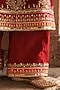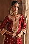 Sheetal Batra presents a mesmerizing deep red A-line kurta in silk chanderi base with pearl, sequins, kashmiri tilla and gota patti embroidery. It is paired with palazzo pants and a silk organza dupatta. Style it with kundan polki earrings, a braided hairstyle and block heels, ideal for weddings or a bridal look.