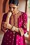 Sheetal Batra presents a mesmerizing hot pink choga kurta in pure silk chanderi banarasi base with bell sleeves, pearl, sequins, kashmiri tilla and gota patti embroidery. It is paired with bamberg satin salwar pants. Style it with meenakari statement earrings, a half-up braided hairstyle and wedges, ideal for sangeet ceremonies or colorful festive gatherings.