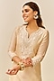 Featuring a beige A-line short kurta for girls in chanderi silk base with parsi gara embroidery. It is paired with a bamberg satin salwar. Style it with cute hair accessories and sandals for a festive occasion or wedding ceremony.