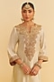 Featuring a daisy ivory long kaftan for girls in upada silk base with kiran dori and pearl embroidery. It is paired with a dogri salwar. Style it with cute hair accessories and sandals for a festive occasion or pooja ceremony.