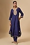 Featuring a deep blue long kaftan for girls in uppada silk base with zero neckline, embroidered pockets, kiran dori embroidery, and pearl detailing. It is paired with a dogri salwar. Accentuate with an embellished headband and a sling bag for a festive occasion or family gathering.
