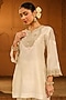 Featuring an ivory short kurta for girls in silk chanderi base with bell sleeves, kashmiri tilla, and parsi gara embroidery. It is paired with satin silk pants. Style it with cute hair accessories and sandals for a festive occasion, pooja ceremony or pre-wedding functions.