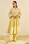 Sheetal Batra presents a lemon yellow kurta in chanderi silk base with a zero-neckline, bell sleeves, basra, gota and parsi gara embroidery. It is paired with bemberg satin salwar pants. Accentuate with statement earrings and heels for a festive occasion, haldi or sangeet ceremony.