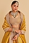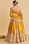 Sheetal Batra presents a mustard gold lehenga in pure silk tissue base with dabka, pearl and zardosi embroidery. It is paired with an embroidered blouse having a broad scoop neckline and plunging back, including a dupatta with boota details. Accentuate it with kundan polki jewellery, embellished heels and a potli bag for a complete look, perfect wear for a wedding, sangeet or engagement ceremony.