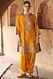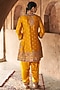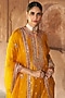 Sheetal Batra presents a mesmerizing mustard A-line kurta in pure silk banarasi base with bell sleeves, pearl, sequins, kashmiri tilla and gota patti embroidery. It is paired with bamberg satin salwar pants and a silk organza dupatta. Style it with kundan polki earrings, a braided hairstyle and wedges, ideal for haldi ceremonies or colorful festive gatherings.