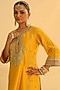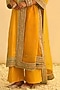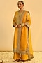 Featuring a mustard kurta in silk chanderi base with kashmiri tilla, gota, applique and kundan embroidery. It is paired with palazzo pants and a silk organza dupatta. Accentuate it with statement jewellery and heels for festive occasions, haldi or sangeet ceremonies.