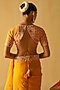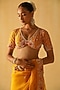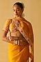 Sheetal Batra features a mustard saree in silk organza base with dabka and zardosi embroidery. It is paired with a raw silk embroidered blouse having a v-neck. Accentuate with statement jewellery and heels for a wedding, haldi or engagement ceremony.