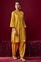 Featuring a mustard yellow kurta crafted in upada silk fabric with a placket front, aari tilla embroidery, gota edges, delicate pearls, and sequins. It is paired with salwar. Accentuate it with polki jewellery, a potli bag, and wedges for festive occasions and wedding ceremonies.