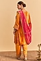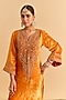 Sheetal Batra presents an orange kurta crafted in velvet base with aari, pearls and kiran dori embroidery. It is paired with silk salwar pants. Accentuate the look with ethnic earrings, an embellished potli bag and wedges for perfect festive gatherings, wedding functions or cultural celebrations.