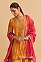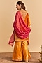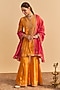 Sheetal Batra presents an orange kurta crafted in velvet silk base with sequins, pearls and aari tilla embroidery. It is paired with embroidered flared palazzo pants and a tissue silk dupatta. Accentuate the look with ethnic earrings, an embellished potli bag and wedges for perfect festive gatherings, wedding functions or sangeet celebrations.