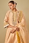 Featuring a peach kurta in silk chanderi base with kundan work, gota, applique and kashmiri tilla embroidery. It is paired with straight palazzo pants and a silk organza dupatta. Accentuate it with statement jewellery and heels for a festive occasion, wedding or engagement ceremony.