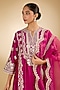 Featuring a pink choga kurta in pure silk chanderi base with a zero-neck design, bell sleeves, tilla, gota and parsi gara embroidery. It is paired with bemberg satin salwar pants and a silk organza dupatta. Accentuate it with jhumkas and embellished juttis for a wedding ceremony, festive celebration or traditional gathering.
