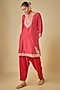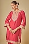 Featuring a pink bandhej short kurta in upada silk base with pearl, sequins and kashmiri tilla embroidery. It is paired with dogri salwar pants. Accentuate it with statement jewellery and heels for a festive occasion or pooja ceremony.