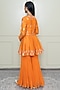 Featuring a pumpkin orange peplum kurta in silk chanderi base with kashmiri tilla, pearls, and gota embroidery. It is paired with matching georgette gharara pants and a scarlet red silk organza dupatta. Accentuate it with dangler earrings and heels for a festive occasion or an engagement ceremony.