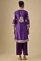 Featuring a purple kurta in chanderi silk base with a mandarin collar, kashmiri tilla embroidery and placket detail. It is paired with bemberg satin salwar pants and a silk organza dupatta. Accentuate it with statement jewellery and heels for a festive occasion, pooja or any pre-wedding ceremony.