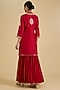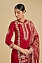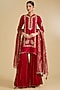 Featuring a red kurta in pure habutai silk base with gota patti, dabka, kasab and pearl embroidery, including a mandarin collar and potli buttons. It is paired with pure georgette gharara pants and a silk organza tissue dupatta. Accentuate it with dangler earrings and heels for a festive occasion or sangeet ceremony.