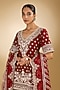 Featuring a red short straight kurta in pure silk chanderi base with a deep v-neckline, bell sleeves, tilla, gota and parsi gara embroidery. It is paired with embroidered sharara pants and a silk organza dupatta. Accentuate it with jhumkas and embellished juttis for a wedding ceremony, festive celebration or traditional gathering.