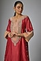 Featuring a red choga short kurta in silk chanderi base with kashmiri tilla embroidery, including kundan, applique and gota work. It is paired with bamberg satin salwar pants. Accentuate it with statement jewellery and heels for festive ceremonies.