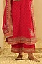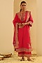 Sheetal Batra features a red bandhej long A-line kurta in upada silk base with gota detail, kashmiri tilla, pearl and sequins embellishments. It is paired with palazzo pants and a silk organza dupatta. Accentuate with statement jewellery and heels for a festive occasion or sangeet ceremony.