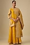 Featuring a yellow short kurta in pure silk chanderi base with a zero neckline, placket detail, gota patti and dabka zardosi hand embroidery. It is paired with a kalidar sharara pants and a dupatta. Accentuate it with statement jewellery and heels for a festive occasion, wedding or haldi ceremony.